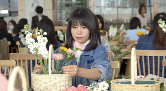 繁花似錦報(bào)春來,天姿國色抒情懷?;顒?dòng)現(xiàn)場(chǎng)花香四溢、芬芳溫馨,充滿著春天般的氣息,大家手捧鮮花,在花藝?yán)蠋煹闹v解下,開始學(xué)習(xí)各種鮮花所蘊(yùn)含的花語祝福和選花、裁剪、搭配、造型及養(yǎng)護(hù)等藝術(shù)插花技巧。隨后,女工們將原本普普通通的月季、康乃馨、蝴蝶蘭、滿天星、向日葵等多種花材修剪整枝,根據(jù)不同的色彩和形狀有層次地搭配在一起。通過精心構(gòu)思造型、發(fā)揮創(chuàng)意想象,有的注重意境創(chuàng)設(shè)追求,有的突出枝情花韻之趣,有的抒展自然樸實(shí)風(fēng)格……在細(xì)致地修飾和精心地創(chuàng)作下,一枝花、一棵草都變得詩情畫意和清新怡人,節(jié)日的喜慶氣氛瞬間升騰。