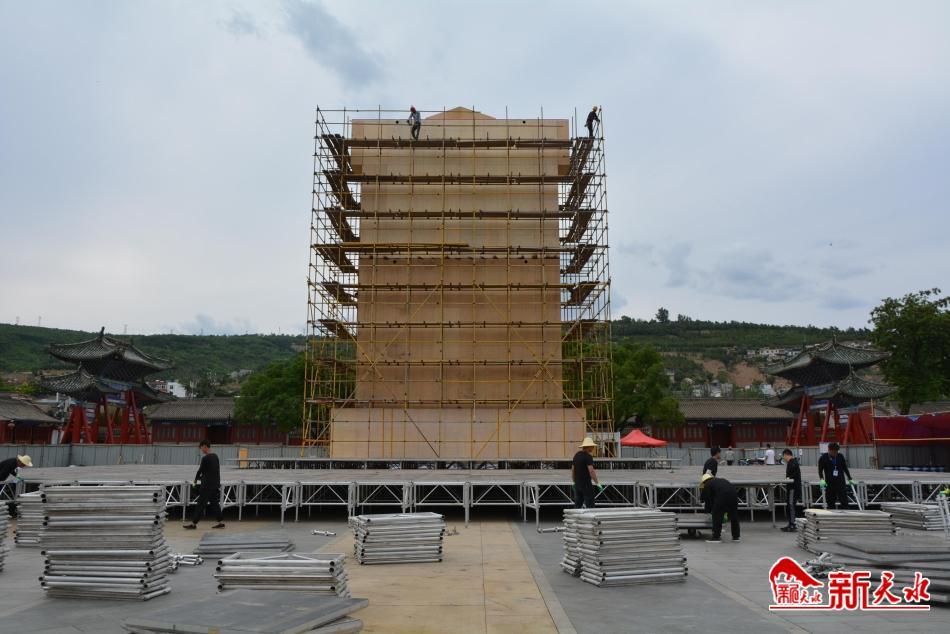 新天水訊【記者何慧娟 張彬霞】2023(癸卯)年公祭中華人文始祖伏羲大典將于6月22日舉行。日前,記者來到伏羲廟廣場看到,公祭伏羲大典文化豐碑矗立在藍(lán)天白云下,看起來雄渾壯麗,主舞臺(tái)搭建,旗桿、旗墩翻新等工作正有序開展,施工現(xiàn)場一派繁忙景象。
