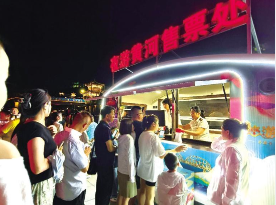 夜幕降臨,黃河兩岸璀璨“霓虹”逐一亮起,蘭州白塔山碼頭游船售票處、登船安檢處都排起了數(shù)十米的長隊。金城壹號、悠游蘭州號、墨跡號等十多艘輪船載著南來北往的游客穿梭于黃河之上,為夜晚的黃河之濱平添了一絲流動的色彩。