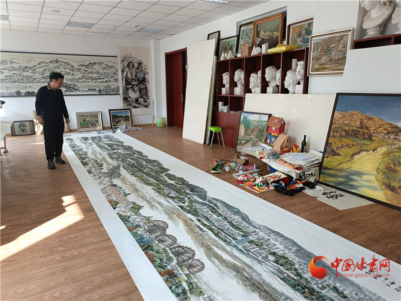 7年前,李建春曾經(jīng)在黑板上素描畫蘭州中山橋、白塔山走紅,在他的筆下蘭州就是一幅畫。這些年,李建春老師靜心創(chuàng)作,希望將蘭州的人文符號通過長卷表達出來。