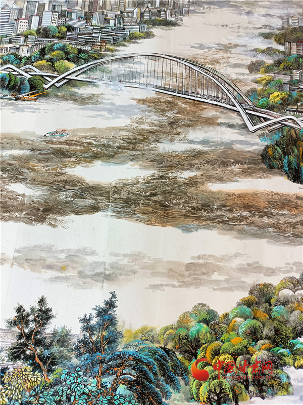 李建春,黃河上的橋梁也是他構(gòu)思畫面的重要部分,從小西湖出發(fā),有小西湖黃河大橋,中山橋,元通大橋,城關(guān)黃河大橋,金雁黃河大橋等各有特色的橋梁,但是畫的多了畫面被割裂,畫的少了有顯示不出來黃河的人文景觀,最后他畫了中山橋和金雁黃河大橋,就像畫框一樣圈住了城市的風景。