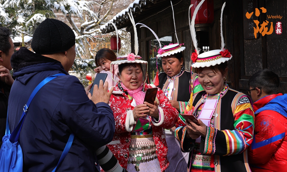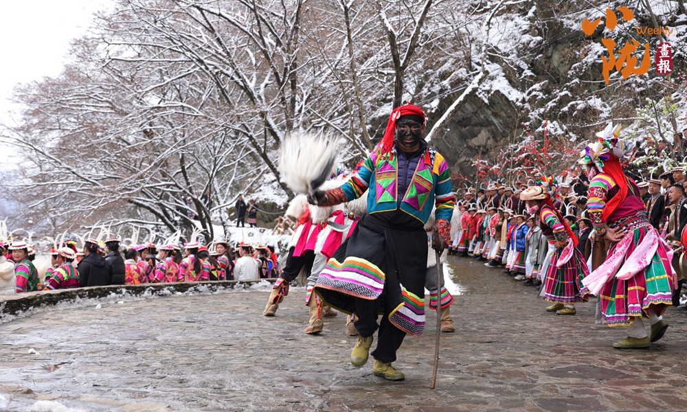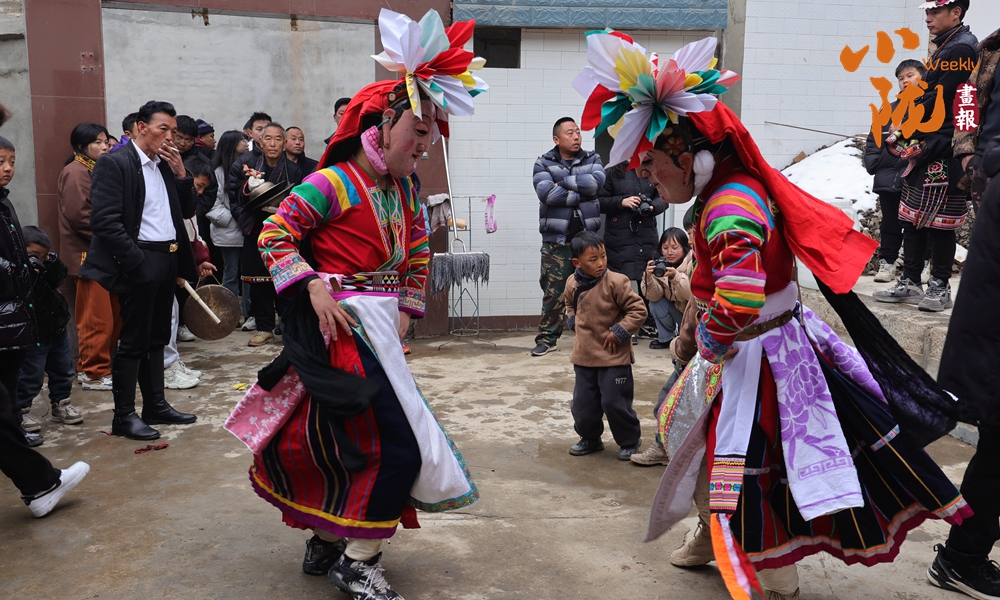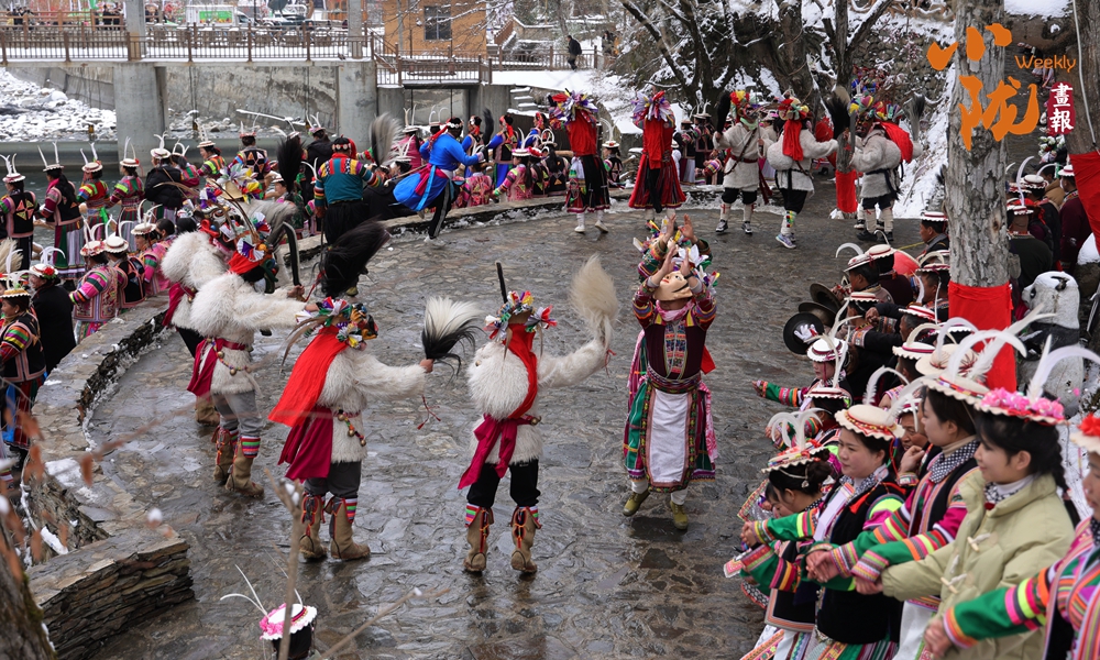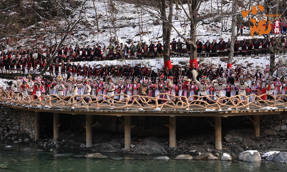 河畔的小路上和河岸的觀(guān)景臺(tái)上,白馬人身著特色服飾,錯(cuò)落有致,載歌載舞,跳起了獨(dú)具魅力的“池哥晝”。