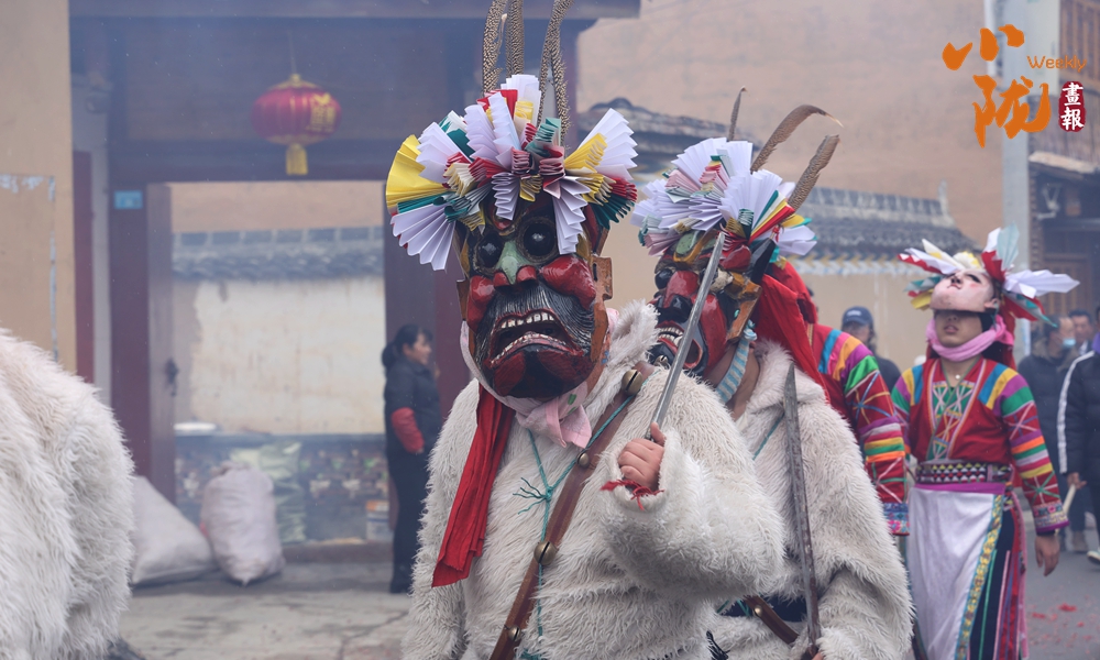 表演的隊(duì)伍圍著寨子挨家挨戶(hù)去跳,舞者至少三人,三人以上不限,皆頭戴面具,在“咚咚咚”的鼓聲和“哐哐哐”的鑼聲伴奏下激烈地跳躍,最后跳到田邊地角為止。