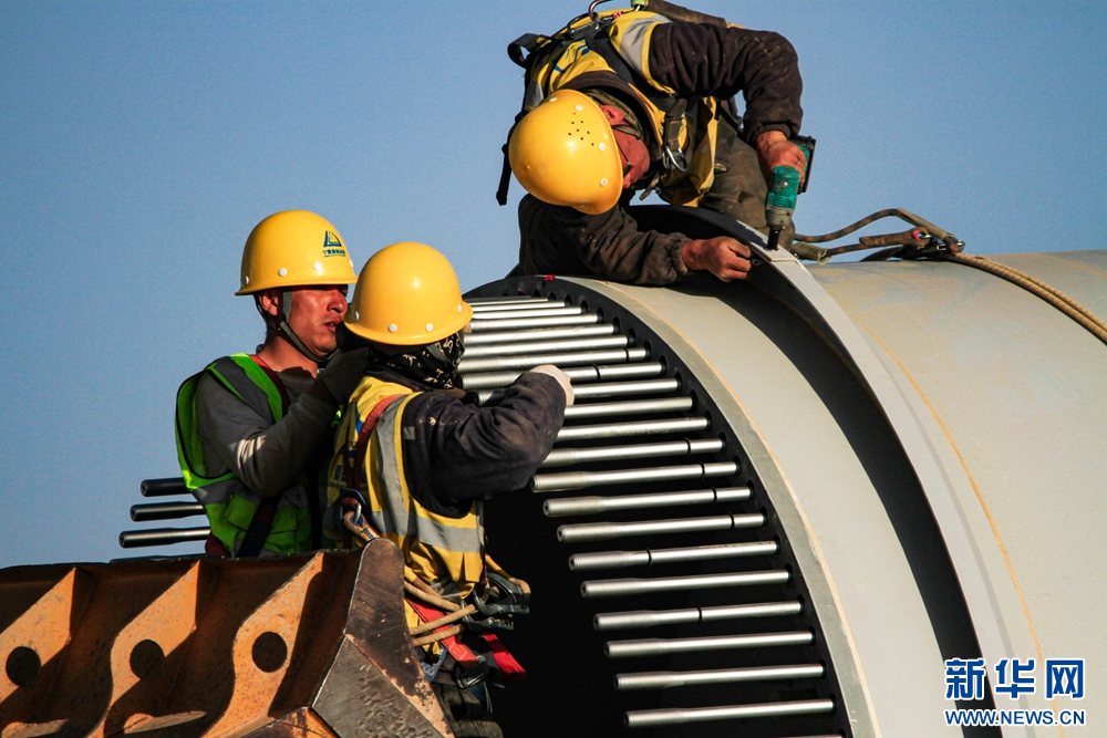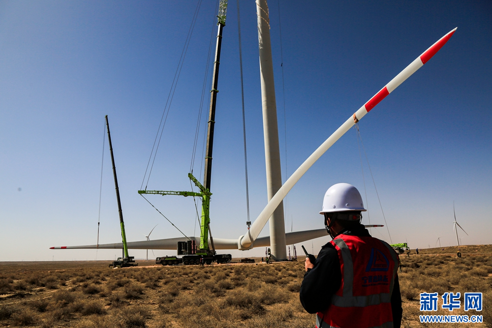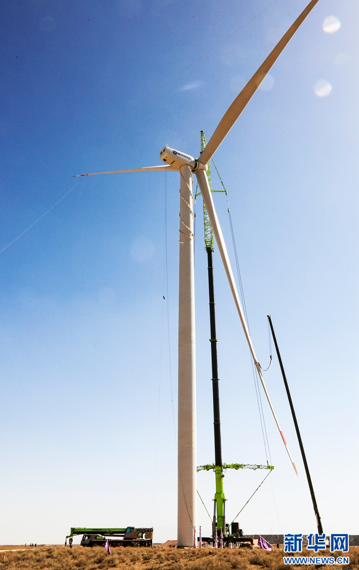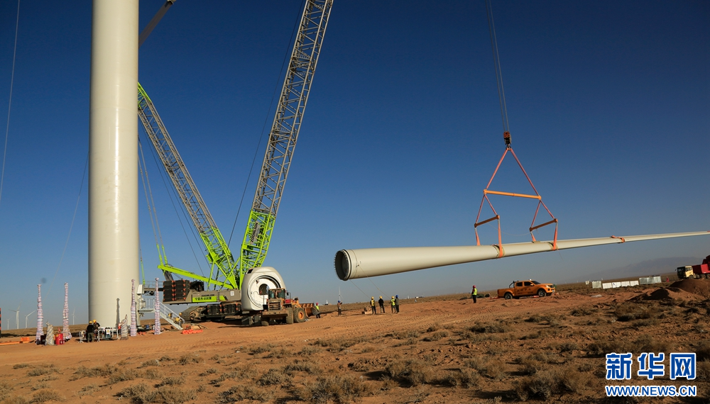 近日,在甘肅省張掖市甘州區(qū)平山湖20千瓦風(fēng)電施工現(xiàn)場,工人們緊張有序地進(jìn)行風(fēng)電設(shè)備安裝工作。新華網(wǎng)發(fā)(陳禮 攝)