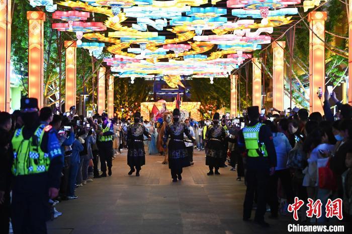 5月3日晚,甘肅省蘭州市七里河區(qū)蘭州老街上演的大型情景巡游《樓蘭之旅》吸引游客。李亞龍 攝
