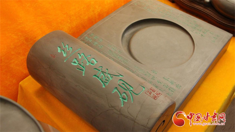 嘉峪石硯,取材于嘉峪山后的黑山峽深處,故又稱“黑山石硯”,是目前所知最早的古石硯之一。這種石硯質(zhì)堅而細(xì)、扣之有聲,發(fā)墨快而不損毫,儲墨久而不干,“有史記載的三百多種石硯中,只有嘉峪石硯是帶有銘文出土的。這對于石硯的研究具有重要的史料價值。”劉宗學(xué)向?qū)嵺`團成員系統(tǒng)地講述了嘉峪石硯的傳承歷史,并展示了自己以絲綢之路為主題創(chuàng)作的“絲路盛硯”組合石硯。這套石硯主要以甘肅十四個地州市的建筑、景觀、歷史人物為內(nèi)容,體現(xiàn)了甘肅省的根脈文化、黃河文化、長城文化、絲路文化、紅色文化等五大文化,表現(xiàn)出甘肅在絲綢之路經(jīng)濟發(fā)展與文化交流中的重要作用。