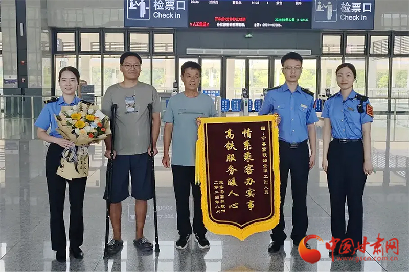 中國(guó)甘肅網(wǎng)8月29日訊(西北角·中國(guó)甘肅網(wǎng)記者 沈文剛 通訊員 閆軍 王梁)8月22日,正值處暑節(jié)氣。隴東地區(qū)籠罩在“秋老虎”的悶熱之中。上午10時(shí),一位拄著雙拐的男士在家人陪伴下,帶著鮮花和錦旗來到銀西高鐵寧縣站候車室。