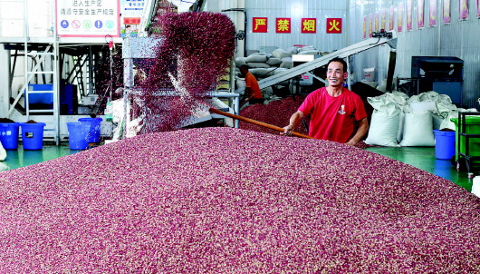 9月10日,甘谷花椒集散交易中心工人正在加工收購(gòu)的花椒。甘谷花椒種植歷史悠久,所產(chǎn)花椒色澤鮮紅、粒大肉厚、麻味悠長(zhǎng)、清香濃郁,是國(guó)內(nèi)紅花椒中的精品。目前,全縣花椒種植面積22萬(wàn)畝,預(yù)計(jì)年產(chǎn)量1.6萬(wàn)噸以上,產(chǎn)值11.5億元以上,花椒樹(shù)真正變成了群眾致富的“搖錢(qián)樹(shù)”。 新天水·天水日?qǐng)?bào)記者李旺旺攝