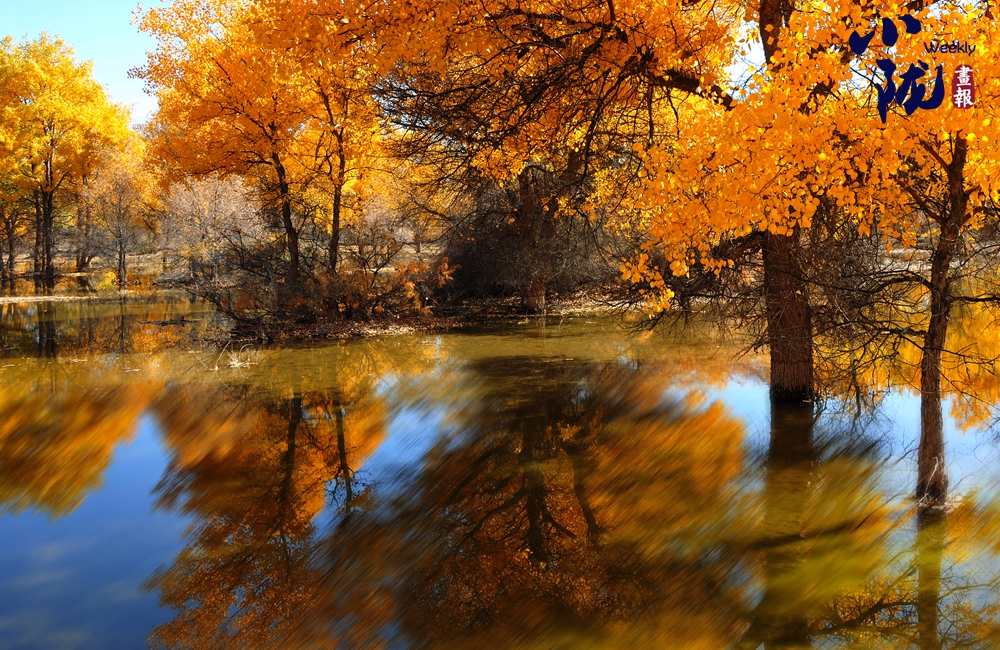 那清澈的金波湖面倒映著胡楊高大的身影,多姿的樹干,黃色的樹葉,都毫不保留地在水中展示出來。