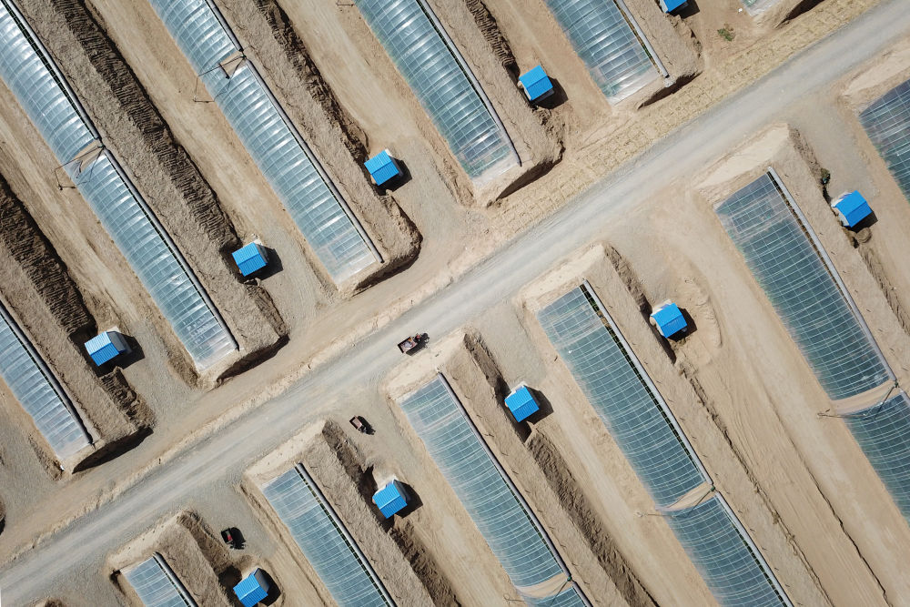 在古浪縣干城鄉(xiāng)富民新村,村民駕駛?cè)嗆?chē)行駛在日光溫室大棚間的道路上(無(wú)人機(jī)照片)。新華社記者范培珅攝