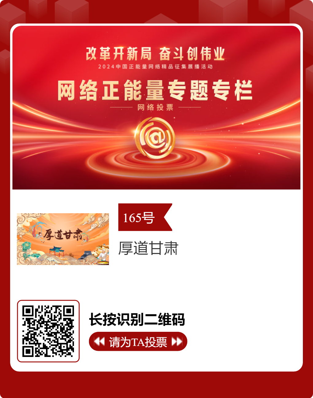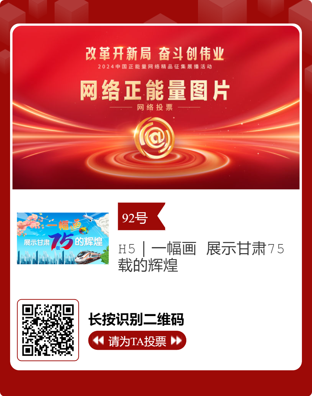 經(jīng)過初選,由甘肅省委網(wǎng)信辦和白銀市委網(wǎng)信辦選送的3件作品脫穎而出,進入終選。在此,誠邀每個充滿正能量的你,為優(yōu)秀作品投票點贊,為甘肅正能量發(fā)聲。