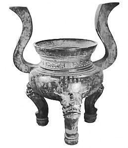 明崇禎三年韓王亶公式造銅鼎:鼎高1.01米,口徑0.493米。侈口斜沿,內(nèi)折窄唇,束頸,溜肩,“S”形對稱高耳,鼓腹,圜底,獸面吐舌形三高足,足跟缽形。頸上部飾凸弦紋四道,頸中部浮雕夔龍六條,雷紋襯地,頸下部飾三道凸弦紋,肩形二道凸弦紋。腹部鏨刻紀(jì)年、造者、監(jiān)造、工匠等銘文59字。