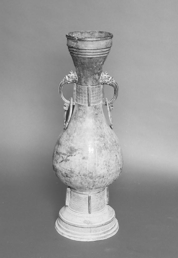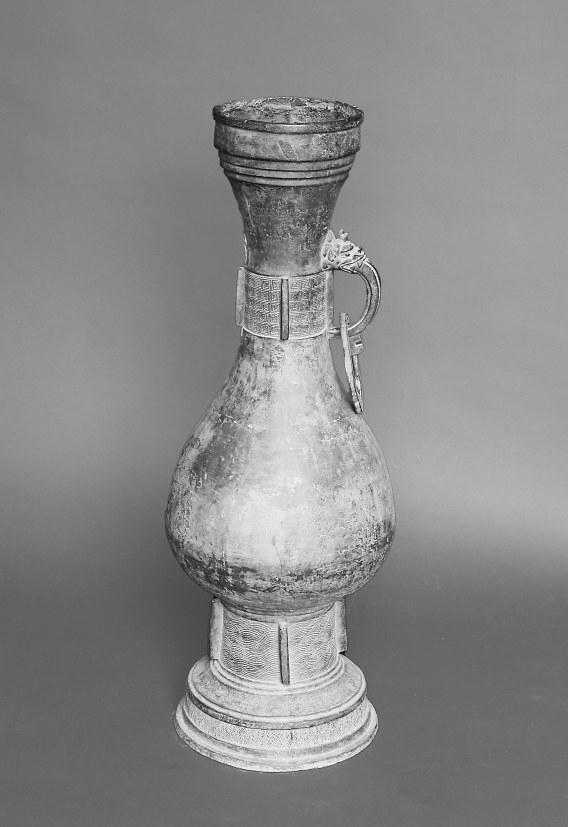 明獸面銜環(huán)耳銅瓶:該銅瓶古樸修長、厚重。銅瓶為一對,形制及紋飾相同,高0.9米,口徑0.19米,重43.86千克。直口,外卷方唇,束長頸,對稱置獨(dú)角獸吐舌形半環(huán)耳,下帶小珥,耳套如意形環(huán),垂膽形腹,束高脛,下為折肩形圈足,足口外撇,無底??谘叵嘛椚腊枷壹y,頸部飾四個(gè)等分菲棱,間以雷地紋,脛部飾四菲棱間以鱗形波浪紋,圈足飾菲棱形回紋。銅瓶原存放于崆峒山太和宮真武殿真武像前,置于韓王鼎左右。