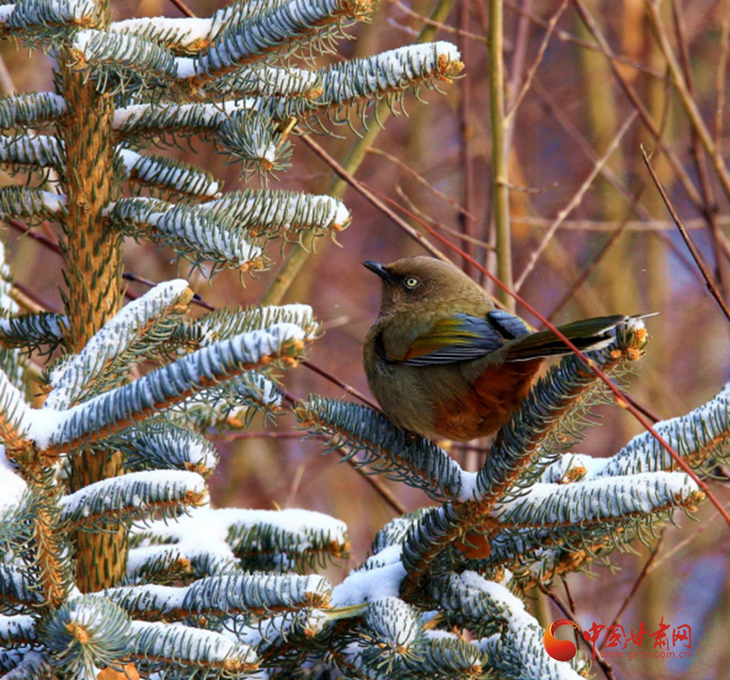 鏡頭之中,一只橙翅噪鹛靜棲于積雪覆蓋的松枝之上,宛如冰雪秘境中的靈動精靈。它通體覆著柔和的灰褐色羽衣,橙黃色的初級飛羽在皚皚白雪的映襯下愈發(fā)鮮亮,臀部與下腹部的黃褐色絨羽則增添了幾分溫婉質(zhì)感。鳥兒側(cè)首凝望,眼眸澄澈靈動,將這一山地物種特有的警覺與優(yōu)雅姿態(tài)展現(xiàn)得淋漓盡致。