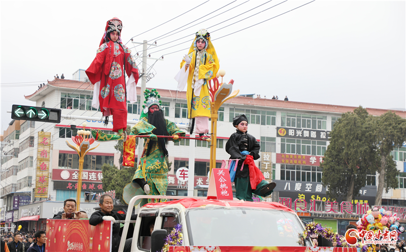 磐安、安遠、禮辛三鎮(zhèn)聯(lián)合打造的高臺方陣同樣吸睛奪目,藝人將戲劇人物、神話傳說以驚險奇巧的造型凌空呈現(xiàn),端坐高架的孩童揮手致意,成為街頭極具視覺沖擊力的流動風景,彰顯著民間藝人的非凡智慧與膽識。“高臺是咱們甘谷的絕活,精巧又驚險,老祖宗傳下來的好東西,代代都好看!”現(xiàn)場老人的稱贊道出了大家對本土非遺的喜愛。