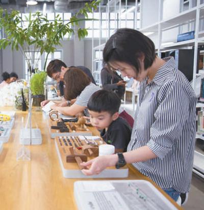 在泰國(guó)創(chuàng)意與設(shè)計(jì)中心圖書(shū)館,來(lái)訪者正在位于二層的材料體驗(yàn)區(qū)參觀。泰國(guó)創(chuàng)意與設(shè)計(jì)中心圖書(shū)館供圖