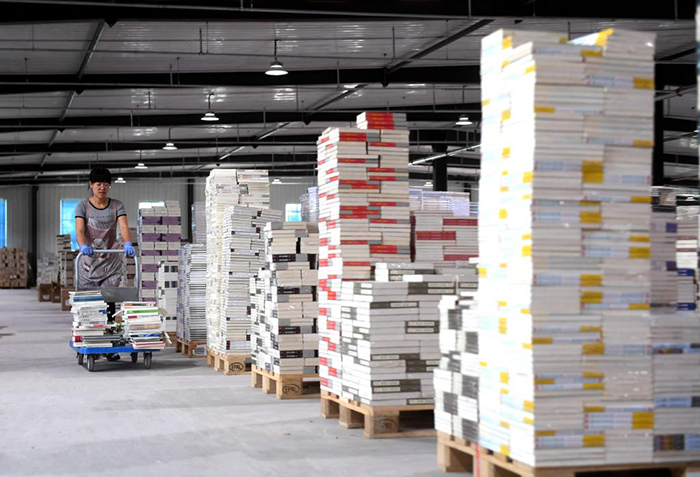 7月2日,在永清縣三圣口鄉(xiāng)一家圖書文化企業(yè)倉儲中心,工作人員在整理圖書。