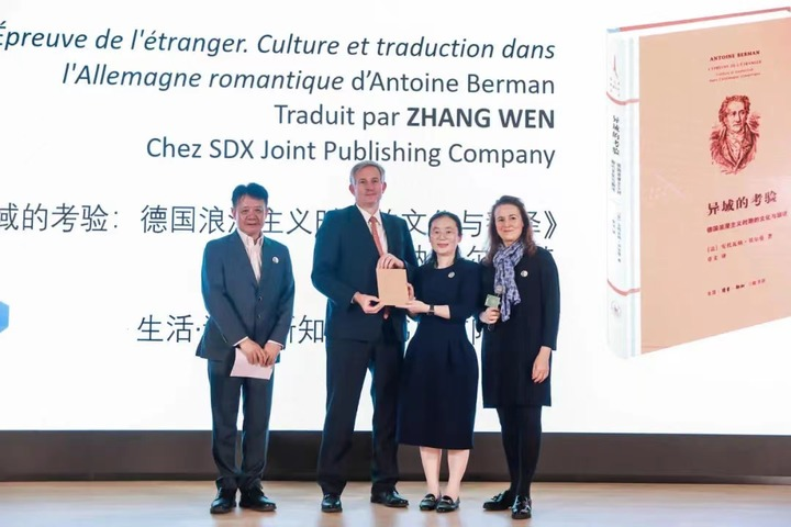法國(guó)駐華大使羅梁(左二)為社科類(lèi)獲獎(jiǎng)譯者頒獎(jiǎng)。法國(guó)駐上??傤I(lǐng)事館供圖