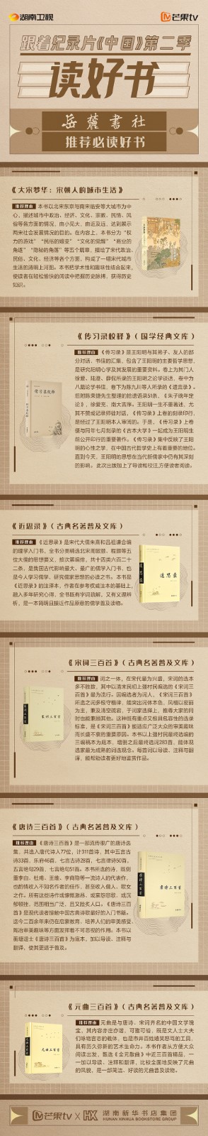 芒果TV以紀(jì)錄片《中國(guó)》第二季的精美品質(zhì),聯(lián)合湖南新華書店集團(tuán)的美譽(yù)口碑,將中華書局、上海古籍出版社、岳麓書社推薦的珍品好書,傾情向大眾推薦。本次“跟著紀(jì)錄片《中國(guó)》第二季讀好書”活動(dòng),將從2月28日持續(xù)到3月15日,湖南新華書店集團(tuán)旗下湖南圖書城、不吝Boolink書店、全省市級(jí)中心門店、長(zhǎng)沙地區(qū)樂之書店等全員參與,推薦紀(jì)錄片《中國(guó)》第二季。書友及觀眾可登錄微博或到線下門店打卡參與活動(dòng)。
