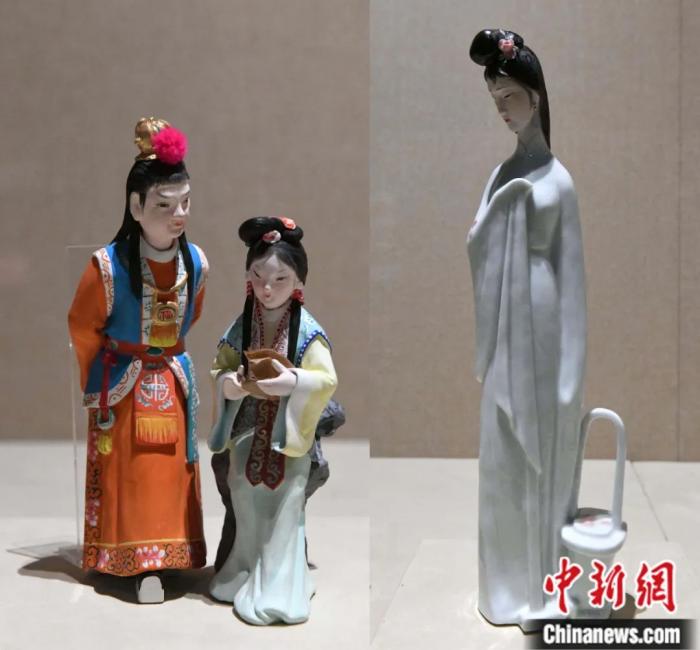 紅樓夢(mèng)題材泥塑《讀西廂》和瓷塑《黛玉葬花》。中新社發(fā) 許建梅 攝