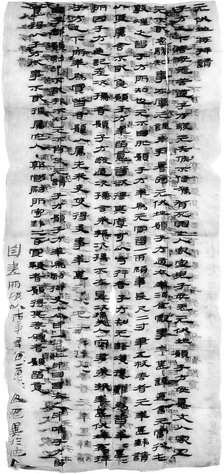 子方足下,善毋恙!苦道子方發(fā),元失候不侍駕,有死罪。丈人、家室、兒子毋恙,元伏地愿子方毋憂。丈人、家室元不敢忽驕,知事在庫(kù),元謹(jǐn)奉教。暑時(shí)元伏地愿子方適衣、幸酒食、察事,幸甚!謹(jǐn)?shù)溃簳?huì)元當(dāng)從屯敦煌,乏沓,子方所知也。元不自外,愿子方幸為元買沓一兩,絹?lái)f,長(zhǎng)尺二寸;筆五枚,善者,元幸甚。錢請(qǐng)以便屬舍,不敢負(fù)。愿子方幸留意,沓欲得其厚、可以步行者。子方知元數(shù)煩擾,難為沓。幸甚幸甚!所因子方進(jìn)記差次孺者,愿子方發(fā)過次孺舍,求報(bào)。次孺不在,見次孺夫人容君求報(bào),幸甚,伏地再拜子方足下!所幸為買沓者,愿以屬先來(lái)吏,使得及事,幸甚。元伏地再拜再拜!