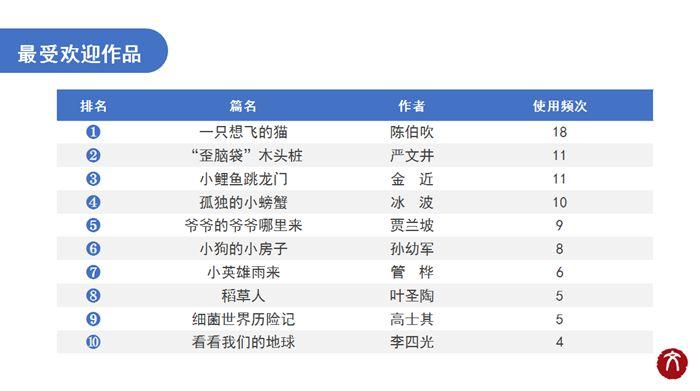2021年度十大作品榜單為:《一只想飛的貓》(作者陳伯吹)、《“歪腦袋”木頭樁》(作者嚴(yán)文井)、《小鯉魚(yú)跳龍門》(作者金近)、《孤獨(dú)的小螃蟹》(作者冰波)、《爺爺?shù)臓敔斈睦飦?lái)》(作者賈蘭坡)、《小狗的小房子》(作者孫幼軍)、《小英雄雨來(lái)》(作者管樺)、《稻草人》(作者葉圣陶)、《細(xì)菌世界歷險(xiǎn)記》(作者高士其)、《看看我們的地球》(作者李四光)。