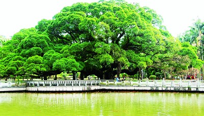 擁有古樹(shù)的城市就是擁有歷史的城市。福州古榕遍布,四季常青,是城市、市民生活與樹(shù)木的完美結(jié)合,是風(fēng)景的自然生長(zhǎng),是歷史根深葉茂地屹立。福州古榕以樹(shù)齡長(zhǎng)、歷史久、數(shù)量眾而著稱。見(jiàn)證福州城市史的,當(dāng)首推鼓山國(guó)家森林公園、八一水庫(kù)旁,福州無(wú)人不知的已近千歲,被譽(yù)為福州榕樹(shù)王的古榕。相傳,這棵古榕是張伯玉所栽植的兩棵樹(shù)苖,光陰荏苒,同氣相求,如今兩棵榕樹(shù)相互糾結(jié)、勾連、纏繞、親密,已無(wú)分彼此。其冠幅達(dá)1300米,可容納千人在樹(shù)下談古論今,聊天遮陰。遠(yuǎn)望,似綠色陵巖;近看,知其為榕也,密密的枝葉把近午的陽(yáng)光切割成碎花點(diǎn),散落、閃亮在榕樹(shù)下的草坪和地衣上。初訪者或?yàn)橛牣悾嘿即笠豢霉砰艆s不見(jiàn)氣根,知榕者會(huì)告訴你,這是一株碩大、古老而不生氣根的細(xì)葉榕。因其冠幅日益長(zhǎng)大,為了支撐沉重的樹(shù)冠、預(yù)防主干折損,便制作了若干石柱,砥柱其間。古榕下有湖塘,錦鯉游泳,不時(shí)生出紅色漣漪。旁有一碑,上刻:榕蔭照水波心漾,觀魚(yú)猶勝花間行。