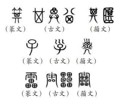 ?。ㄎ澹┧^“9353”,指的是《說文》所收全部正篆,即《說文》分析解釋的全部字?!墩f文》收字以篆文為“正”,作為標(biāo)準(zhǔn)字體,這就是許慎所說的“今敘篆文,合以古籀”的收字原則。“今敘篆文”,就是以篆文(小篆)作為標(biāo)準(zhǔn)正字,同時(shí)也會(huì)根據(jù)需要收列部分古文和籀文?!墩f文》所謂“古文”主要是孔子壁中書和民間所獻(xiàn)古文經(jīng)所用的文字,“籀文”即傳為西周晚期太史籀所編字書《史籀篇》上的文字。從《說文》來看,收入的古文、籀文,主要是與篆文有明顯差異的字形。如篆文“箕”“子”“雷”下所收列的古文、籀文: