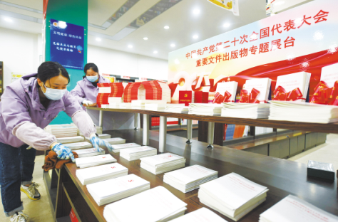 連日來,江蘇省連云港市東??h新華書店精心設(shè)置了黨的二十大重要文件出版物專題展臺(tái),集中展示展銷黨的二十大文件及學(xué)習(xí)輔導(dǎo)讀物,同時(shí)增設(shè)閱讀區(qū),市民可以隨時(shí)閱讀黨的二十大報(bào)告單行本、《黨的二十大報(bào)告輔導(dǎo)讀本》、《中國(guó)共產(chǎn)黨章程》單行本等圖書,吸引了眾多黨員、學(xué)生、市民和機(jī)關(guān)企事業(yè)單位人員等不同群體的讀者前來閱讀選購。