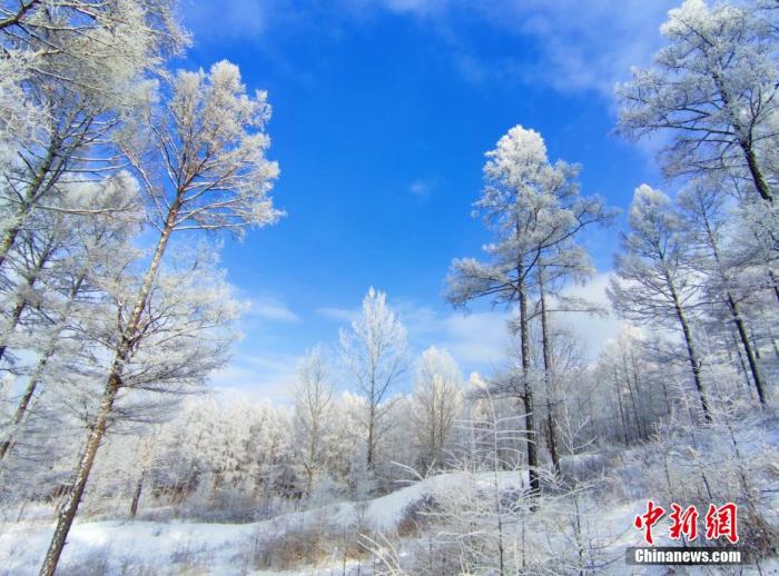 資料圖:根河市出現(xiàn)的大范圍霧凇將群山裝扮成了銀裝素裹的童話世界。 劉麗平 攝