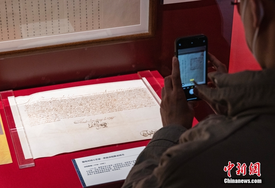 圖為“明清檔案”展區(qū)內(nèi)展示的“葡萄牙國(guó)王若瑟一世致清乾隆帝國(guó)書”展品吸引觀眾用手機(jī)記錄。 中新社記者 侯宇 攝