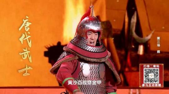 “王于興師,修我甲兵,與子偕行”是統(tǒng)一六國的秦代武士;“戎馬鳴兮金鼓震,壯士激兮忘身命”是平定邊患的漢代武士;“黃沙百戰(zhàn)穿金甲,不破樓蘭終不還”是萬里長征的唐代武士;“壯志饑餐胡虜肉,笑談渴飲匈奴血”是直搗黃龍的宋代武士。這幾位武士代表堪稱《中國詩詞大會(huì)》“史上最強(qiáng)出題天團(tuán)”,為選手們帶來超燃的題目。