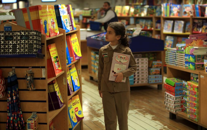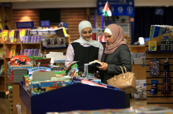 2月13日,在約旦亞喀巴港,一名女孩在“望道號(hào)”上挑選書(shū)籍。