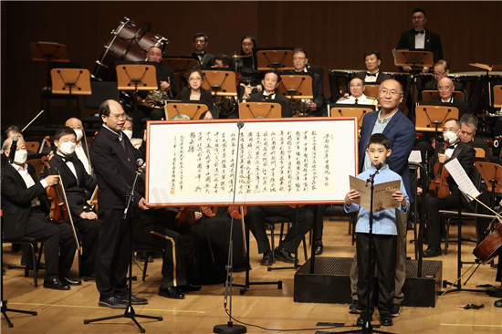 2月23日,北京,“前哲垂范 文津日新”——梁啟超誕辰150周年紀(jì)念配樂朗誦音樂沙龍在國家圖書館舉行。中國國家圖書館館長熊遠(yuǎn)明(左)向梁啟超后人贈手書《少年中國說》。 蔣啟明/攝