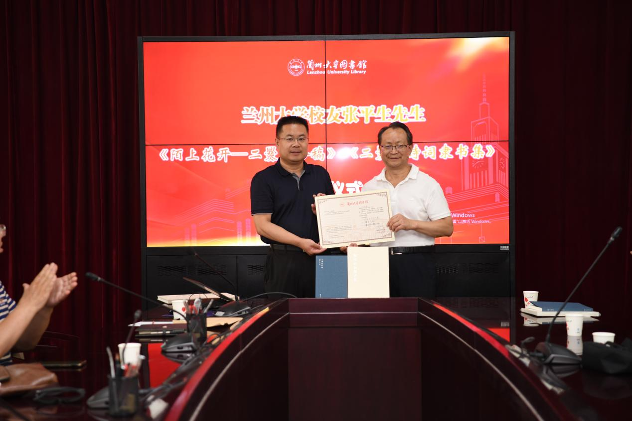 蘭州大學(xué)圖書館及直屬單位黨委書記王偉國(guó)向張平生頒發(fā)收藏證書