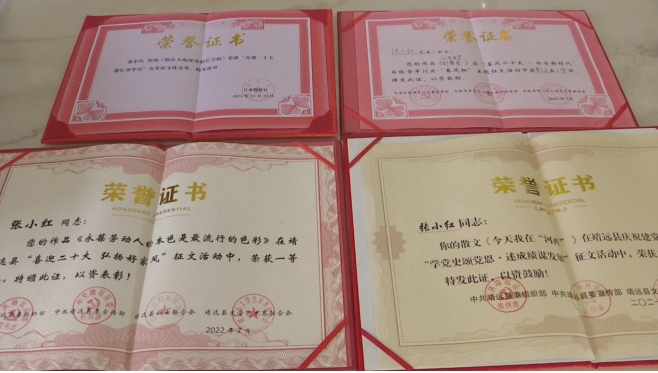 一分耕耘,一分收獲,機(jī)會(huì)總給有心人。如今,張小紅加入了靖遠(yuǎn)縣作家協(xié)會(huì)、白銀市作家協(xié)會(huì)、白銀市文藝評(píng)論家協(xié)會(huì)成為了會(huì)員,也增選為靖遠(yuǎn)縣政協(xié)委員。她的作品散見(jiàn)于《白銀文學(xué)》《烏蘭》等報(bào)刊雜志以及“靖遠(yuǎn)作協(xié)”“隴上風(fēng)情”“黃土情文學(xué)”等文學(xué)公眾號(hào);部分作品榮獲靖遠(yuǎn)縣建黨100周年“學(xué)黨史頌黨恩·述成績(jī)謀發(fā)展”征文二等獎(jiǎng),“喜迎二十大·教壇著華章”《未來(lái)導(dǎo)報(bào)》有獎(jiǎng)?wù)魑膬?yōu)秀獎(jiǎng)等……