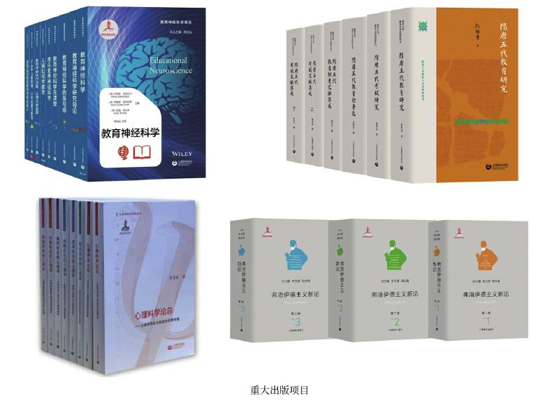 上教社密切關注新時代教育發(fā)展的重大理論問題與現實問題,響應國家教育發(fā)展戰(zhàn)略需求,精心布局學術專業(yè)出版“大項目”,連續(xù)入選國家重點出版物出版規(guī)劃、2013—2025年國家辭書編纂出版規(guī)劃,獲國家出版基金資助。這其中除前文中的大型??乒ぞ邥€包括一系列教育與心理學原創(chuàng)研究和前沿研究成果:由中國教育史學者孫培青編著的“隋唐五代教育與考試研究叢書”,構建了反映隋唐五代教育與考試全貌的教育理論體系和文獻資料體系,是中國教育史學科建設的一項學術文化積累工程;《中國課程史》以現代課程理論為分析框架,以歷史線索展現中國學校課程的新陳代謝;“教育神經科學譯叢”(9冊)是我國首個聚焦教育神經科學這一國際教育研究前沿領域的學術譯介系列;《中國傳統(tǒng)德育心理學思想新論》系統(tǒng)挖掘整理中華優(yōu)秀傳統(tǒng)文化中蘊含的德育心理學思想,構建中國特色心理學話語體系;我國第一套以大心理學觀,從本土心理學視角系統(tǒng)探索和解讀不同形態(tài)心理學的學術系列“心理學形態(tài)研究系列”(6冊),全景考察心理學的命運與前途,深入探索中國本土心理學的選擇與突破;《弗洛伊德主義新論》(三卷)匯聚國內弗洛伊德主義研究領域的權威學者,歷史展現弗洛伊德理論的百年發(fā)展歷程,提供弗洛伊德主義研究的“全景圖”。這些重大出版項目為構建中國特色自主知識體系,建設中國教育學和心理學學科體系、學術體系、話語體系發(fā)揮了重要作用。