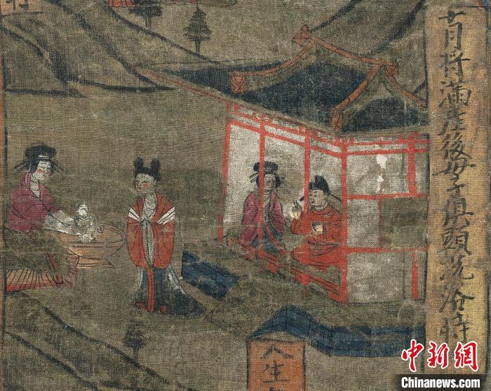 圖為“報(bào)父母恩重經(jīng)變絹畫”中的“十月將滿,產(chǎn)后母子俱顯,洗浴時(shí)”的畫面。(資料圖)甘肅省博物館供圖