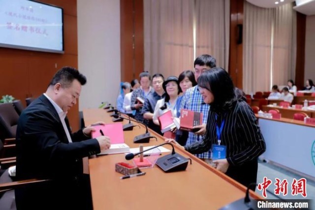 圖為邱華棟向部分參會代表進行現(xiàn)場簽名贈書?!让晒艓煼洞髮W供圖