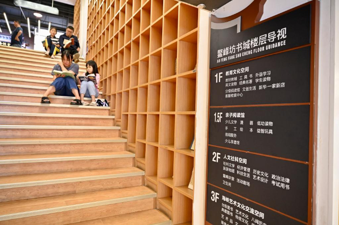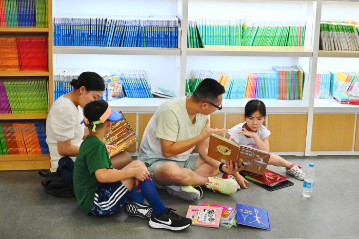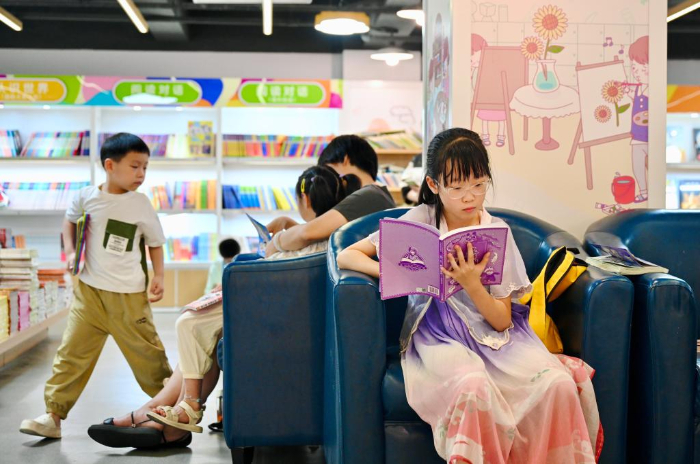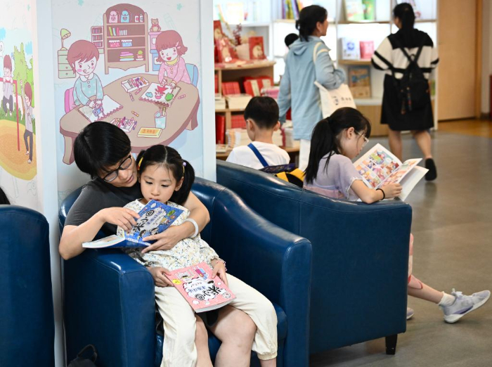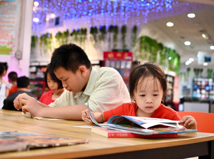 7月6日,福州新華書店鰲峰坊書城內(nèi)家長(zhǎng)陪伴孩子讀書納涼。