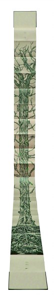 除了材料語言的拓展,展覽中的許多作品還展現(xiàn)出設(shè)計形式的創(chuàng)新與突破。如陳潔瑩的《蟬鳴樹語》聚焦了蟬絢爛而短暫的生命軌跡。書籍的裝幀方式采用經(jīng)折裝,當書本徐徐展開,一棵參天古樹好似拔地而起,貫通全書首尾。由樹根處為起點向上閱讀直至樹冠,可見蟬從卵枝到若蟲,再經(jīng)歷脫殼變?yōu)槌上x的歷程。經(jīng)由巧妙的形式設(shè)計,生命的輪回在書頁間流轉(zhuǎn),詮釋出動人的自然之力。