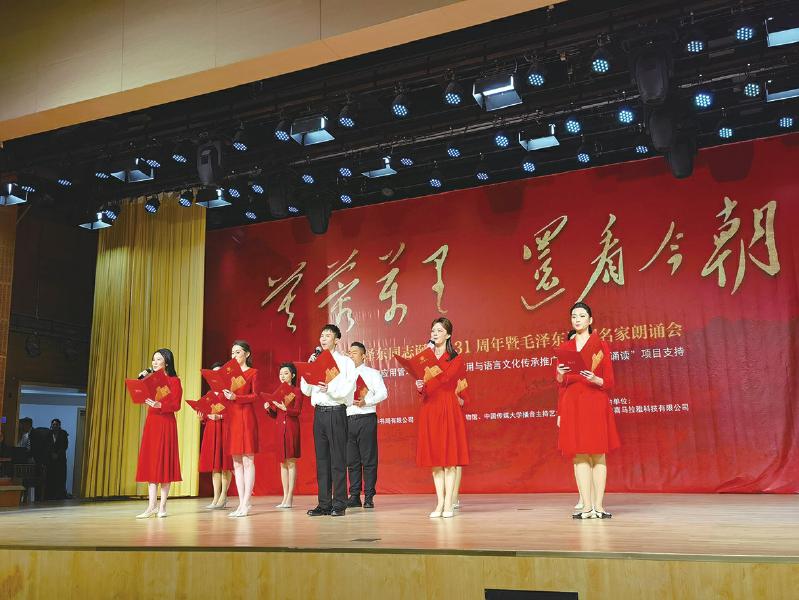 朗誦會(huì)上,中國傳媒大學(xué)學(xué)生誦讀毛澤東同志詞作《沁園春·長沙》。 本報(bào)記者 章紅雨 攝