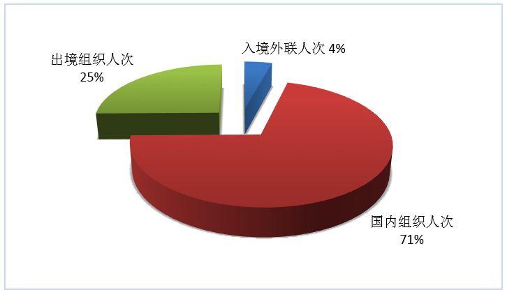 按照入境外聯(lián)人次、國內(nèi)組織人次、出境組織人次三項指標,入境旅游、國內(nèi)旅游、出境旅游市場人次所占份額依次為4%、71%和25%(見圖6)。