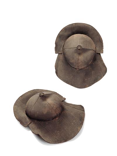 先看前加沿笠帽,大家看是不是有些眼熟?沒錯,這頂帽子與影視劇中英雄俠客們所戴的帽子很相似,《神探狄仁杰》里的李元芳、《水滸》中的林沖外出時就戴類似的帽子。為什么要戴這樣的加沿笠帽呢?為了遮光啊。別小瞧這頂前加沿笠帽,它的背后還有一段歷史故事呢:相傳元世祖忽必烈騎馬射獵時覺得日光太過炫目,聰慧體貼的皇后便為他設(shè)計了這種前面加沿的帽子,戴這種加沿帽遮光效果就好多了,忽必烈非常喜歡,便將這種式樣固定了下來,以后國人紛紛效仿,成為流行款式??墒牵扑问窃谠?,元芳和林沖似乎不該戴類似的帽子?既是藝術(shù)形象,就不用深究了吧。人類智慧相通,英雄更是惺惺相惜,既都是英雄,戴上同款的帽子也是應有之義。