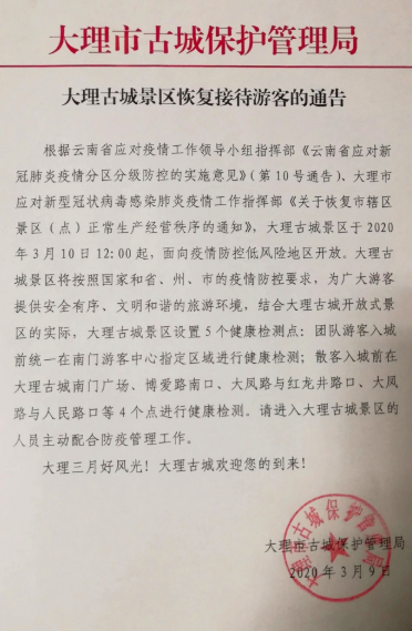 3月9日,云南省大理市古城保護(hù)管理局發(fā)出通告,宣布大理古城景區(qū)于2020年3月10日12:00起,面向疫情防控低風(fēng)險地區(qū)開放。