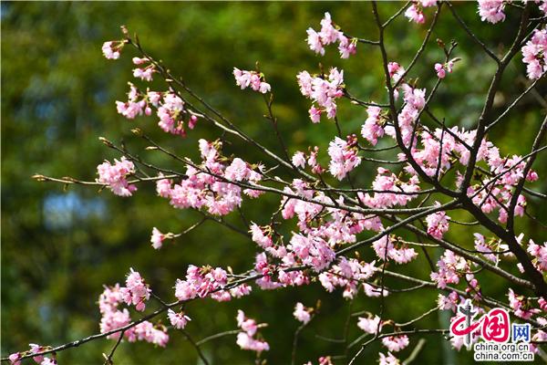 沿著蜿蜒的旅游公路,兩旁海拔600多米的山坡上開(kāi)滿了櫻花,一簇簇櫻花投印在蒼翠山麓與柳綠間,潔白的、粉色的、玫紅的花朵,迎風(fēng)搖曳,儼然一副七彩水墨畫(huà)。