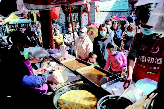 3月22日,在崆峒古鎮(zhèn)小吃一條街購(gòu)買(mǎi)小吃的游客排起了長(zhǎng)隊(duì)。記者 姚志強(qiáng) 攝
