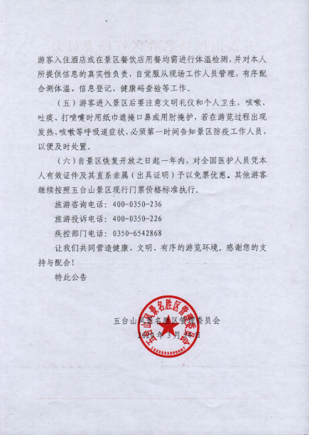 據(jù)悉,五臺山景區(qū)暫不接受現(xiàn)場購票,游客必須在持有健康碼的基礎(chǔ)上,憑本人身份證線上實名購票。所有進(jìn)入景區(qū)人員需佩戴口罩等個人防護(hù)用品。未佩戴口罩者,禁止進(jìn)入景區(qū)。游客經(jīng)體溫監(jiān)測符合健康標(biāo)準(zhǔn)后,需持本人身份證、健康碼前往檢票口檢票;游客入住酒店或在景區(qū)餐飲店用餐均需進(jìn)行體溫監(jiān)測,并對本人所提供信息的真實性負(fù)責(zé),自覺服從現(xiàn)場工作人員管理,有序配合測體溫、信息登記、健康碼查驗等工作。