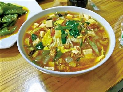 澆頭很“田園”,勾芡不厚不薄,恰到好處,故而色澤鮮亮;用料實在,五花肉丁、豆腐丁、洋芋丁、胡蘿卜丁、黃花菜、黑木耳品種豐富,一絲不茍;面條半個筷頭粗細,微黃半透,勻稱筋道,久泡不爛;佐以熗拌水蘿卜、蒜泥茄子,真的是香濃滑爽,吃完令人毛孔大張,微微汗溢。