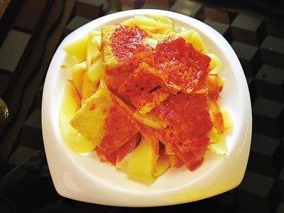 炕鍋洋芋是臨夏農家樂里面常見的一道特色小吃,在臨夏,煎、烙之類的烹飪方式都被稱作炕,炕鍋洋芋因此得名。洋芋切片后,直接放熱油中兩面煎透??诲佈笥蟮淖龇m不復雜,但其對于火候的要求卻極其嚴苛,多一分會焦,少一分則不熟。